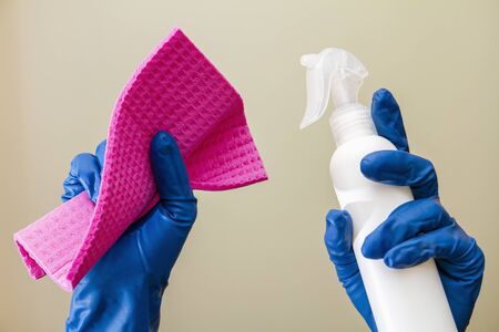 A human hands in protective gloves hold spray disinfectant and cleaning cloth