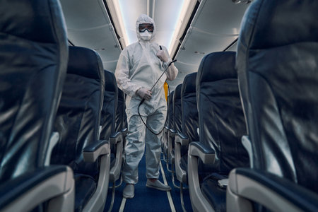 Airline woman staff in Protective suit (PPE) wearing medical face mask disinfecting spray for covid-19 or coronavirus at airplane cabin after or before landing or take off to disease prevention