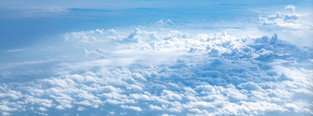 White fluffy clouds below. Look out the window of an airplane in sunny weather from a bird eye view. background