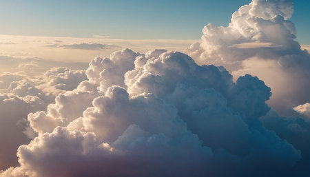 Dramatic cumulonimbus clouds illuminated by the golden light of a sunset, viewed from above the atmosphere with soft...