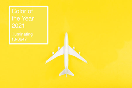 Travel minimal background. Model airplane in flight on an empty colored background. Copy space
