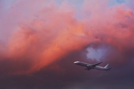 Commercial airplane flying through clouds in dramatic sunset light. Travel concept