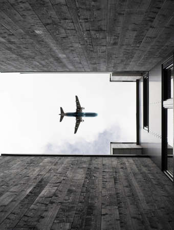 Side view of a commercial airplane flying through dark storm clouds. Blend of 3D and raster images