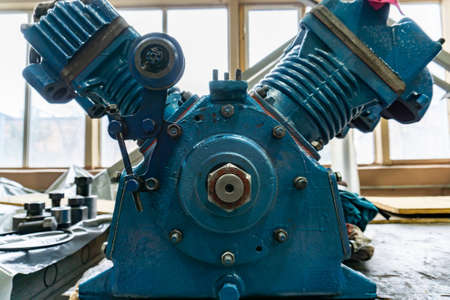 Blue pump compressor for washing cars, indoor. Cleaning concept.
