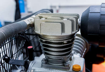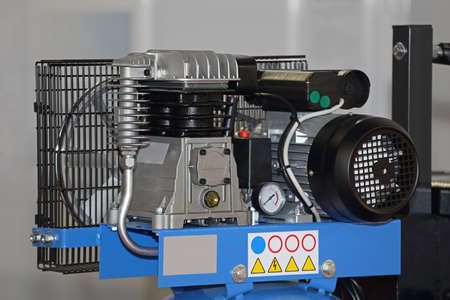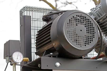 Compressor installation. Belt compressor. Compressor equipped with pressure gauge. Compressed air production. Electrical equipment. Power industry.