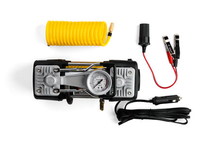 Tire inflator car tool on road. Portable metal air compressor pump for car wheels, driver equipment