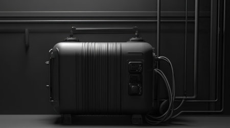 A sleek black industrial generator positioned against a dark background, highlighting its modern design and functional components in a minimalist environment.