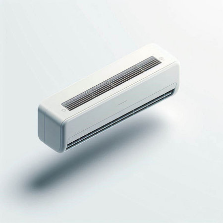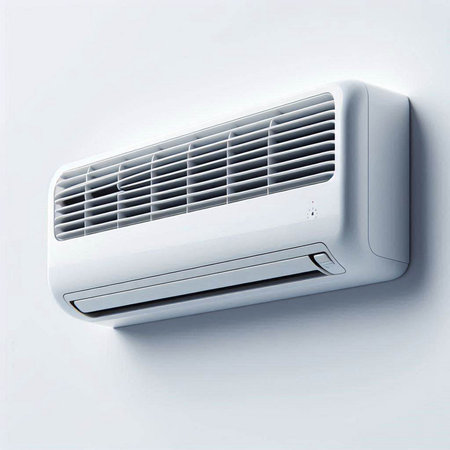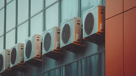 Row of modern air conditioning units on a building wall, efficient and clean design reflecting urban architecture.