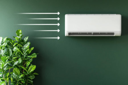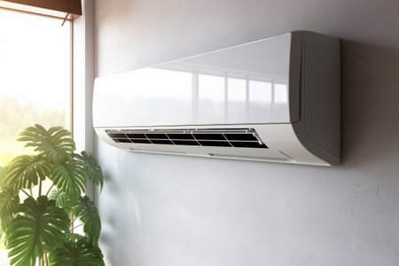 Air conditioner on green wall with fresh plant, emphasizing comfort and climate control in a modern indoor setting, perfect for summer and energy efficiency