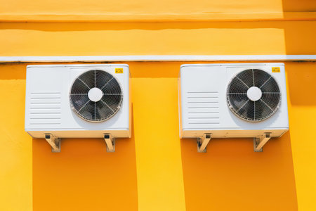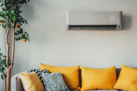 A sleek air conditioning unit mounted on a vibrant yellow wall, providing efficient cooling for a comfortable indoor environment during hot summer days.