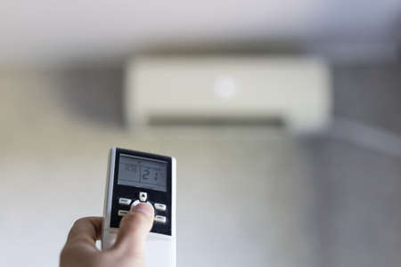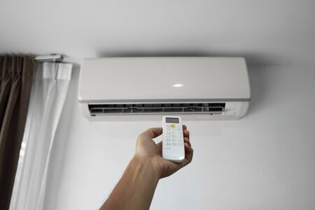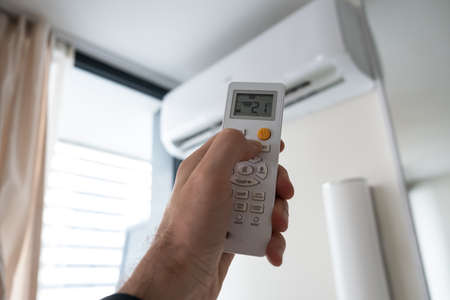 Mans hand using remote controler. Hand holding rc and adjusting temperature of air conditioner mounted on a white wall. Indooor comfort temperature. Health concepts and energy savings.