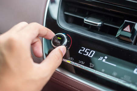 man hand adjusting temperature the air flowing during driving car on the road, air conditioner cooling system inside the car. Adjust, temperature and transport concept