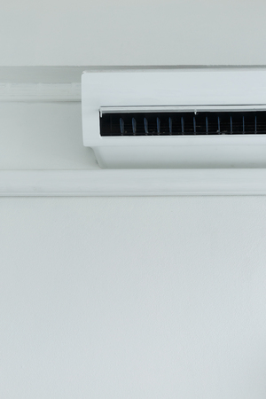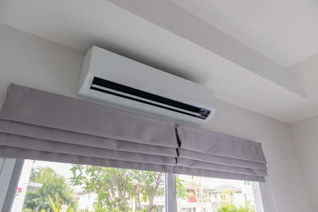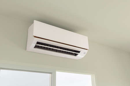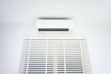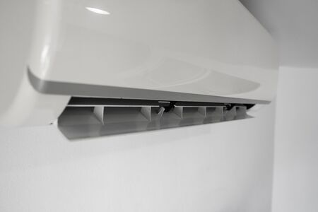 Air conditioner mounted on a white wall in the living room or bedroom. Indooor comfort temperature. Health concepts and energy savings.