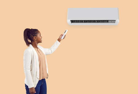 Air cooling and climate control. Satisfied woman turns on or off air conditioner while standing on beige background. Dark skinned young woman directs remote control air conditioner on wall. Isolated