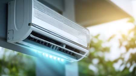 Air conditioner unit mounted on wall with cool blue light blowing air, surrounded by blurred green foliage and warm sunlight