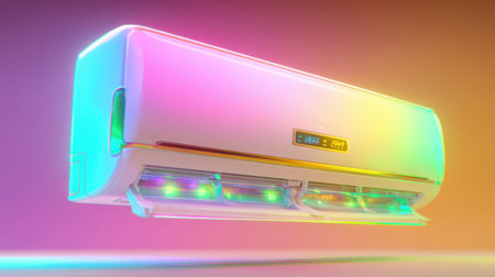 This modern air conditioning unit with a colorful gradient background highlights stylish design in home or office settings. Perfect for summer comfort.