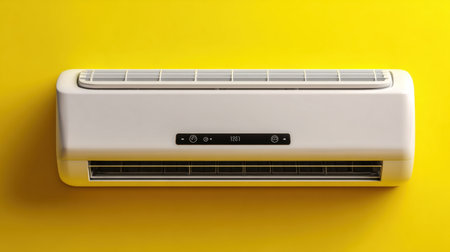 A sleek air conditioner unit positioned against a vibrant yellow background, showcasing its modern design and efficient cooling capability, perfect for summer comfort.