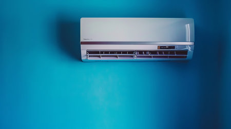 Modern air conditioner unit on a minimal wall generating a visual representation of cool air flowing through a room, symbolizing climate control and fresh living conditions