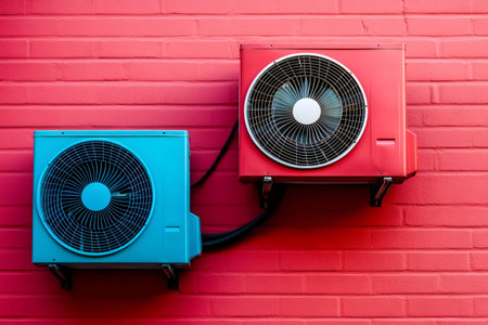 Two air conditioner units, one blue and one red, are mounted on a vibrant red brick wall, providing cooling relief