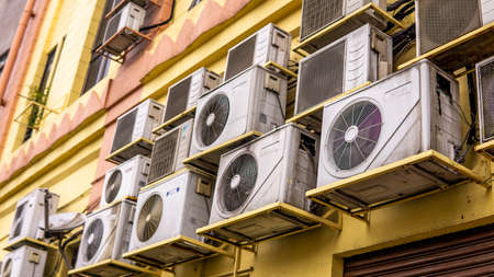 The stacks of air conditioner in the back of shopping mall, store and apartment at the wall of a building.