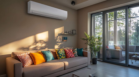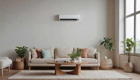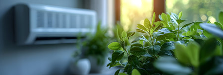 A home with green houseplants, modern air conditioner, and natural sunlight creating a bright atmosphere. Stylish decor with light walls, simple furnishings, and vibrant plants.