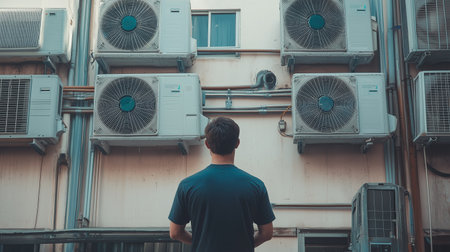 Air conditioner compressor arranged in a row on the balcony, Generative Ai illustration