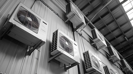 Air conditioners in a factory, black and white image, monochrome