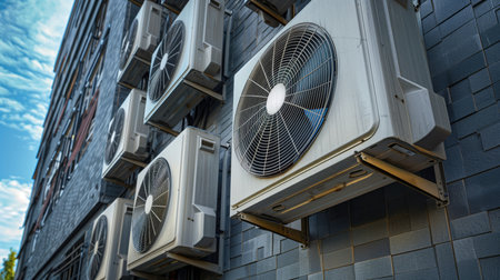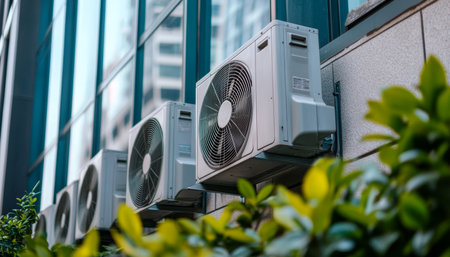 Line of HVAC Air Conditioning Units on Building Wall Surrounded by Greenery, Energy Efficiency