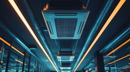 Close-up of a modern air conditioner unit in a sleek office setting, showing contemporary climate control technology.