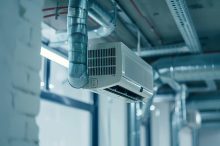 Newly installed air conditioner is hanging from the ceiling of a modern building