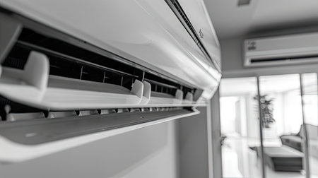 Air conditioner mounted on a white wall in the living room or bedroom. Indooor comfort temperature. Health concepts and energy savings.