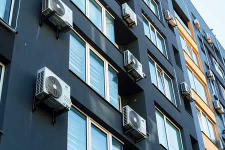 Modern air conditioners hang from the exterior walls of the office building.