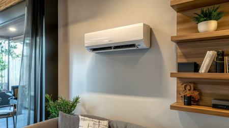 A home with green houseplants, modern air conditioner, and natural sunlight creating a bright atmosphere. Stylish decor with light walls, simple furnishings, and vibrant plants.
