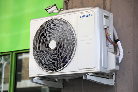 CATANIA, ITALY - AUGUST 7, 2024: Public street view of Samsung brand wall mounted air conditioner unit in Catania city on Sicily island, Italy.