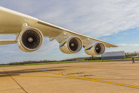 ZAGREB, CROATIA - NOVEMBER 10: Antonov 225 Mriya airplane motor while loading heavy weight cargo on November 10, 2013 Zagreb, Croatia. It is the biggest airplane in the world.