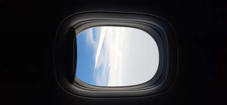 View from the porthole of the airplane window with blue sky and clouds
