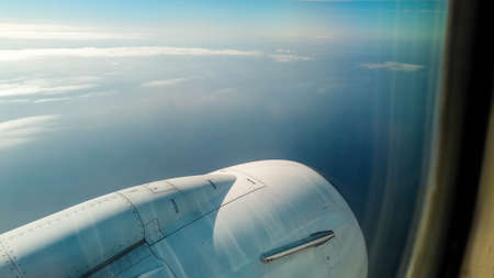 View through airplane window on wing with engine. Plane during flight above clouds.