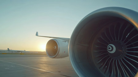 The powerful engine of a modern aircraft is illuminated by the golden light of the setting sun, creating a captivating scene of industrial beauty and the promise of travel