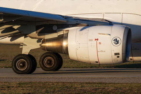 Budapest / Hungary - September 27, 2018: Air France Airbus A321 F-GTAT passenger plane engine close-up, departure and take off at Budapest Airport
