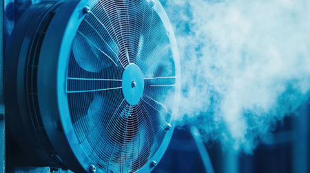 This image features a close-up of an industrial fan emitting mist, highlighting air circulation within a modern cooling system for optimal temperature control.