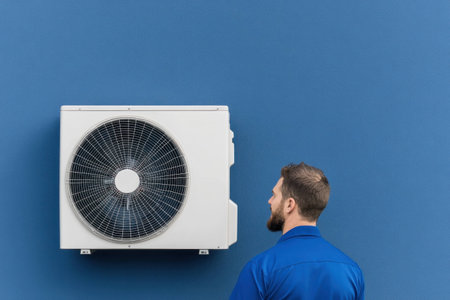 Man in blue uniform inspecting air conditioning unit on blue wall, focused expression highlights HVAC maintenance work, showcasing installation or repair expertise