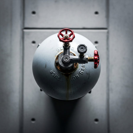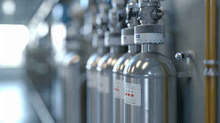 On a brightly lit, modern assembly line, a newly manufactured high-pressure gas cylinder awaits the next stage of production. The gleaming metal and intricate valves represent the pinnacle of precision engineering and industrial quality control.