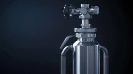 A blue gas cylinder featuring intricate valves against a dark background. Ideal for representing industrial technology, machinery, and safety in various applications.