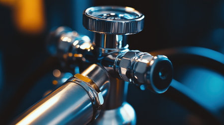 This close-up image showcases a metal pressure regulator with a gauge and connecting hoses, highlighting its precision and industrial design features.