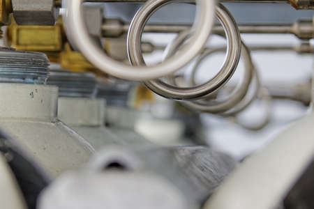 Kaluga, Russia - May, 02, 2021: Tubes, valves, and spacecraft engine control systems in the Tsiolkovsky Museum of the History of Cosmonautics.