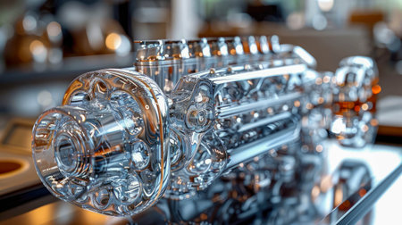 This high-resolution image showcases a close-up view of precision engine components featuring a shiny metallic finish, highlighting intricate details and craftsmanship.