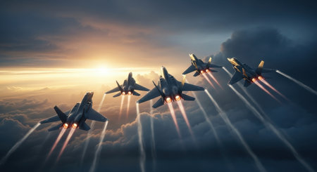 Five advanced fighter jets fly in formation through a dramatic, cloudy sky with a golden sunset. powerful engines leave fiery trails, symbolizing strength and defense.