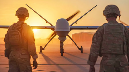 Two soldiers are positioned in front of a drone on a runway during sunset