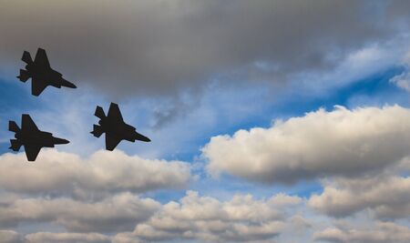 Silhouettes of three F-35 aircraft against the blue sky and white clouds