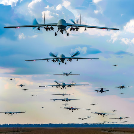 Large group of planes flying in the sky above field of grass. Generative AI.